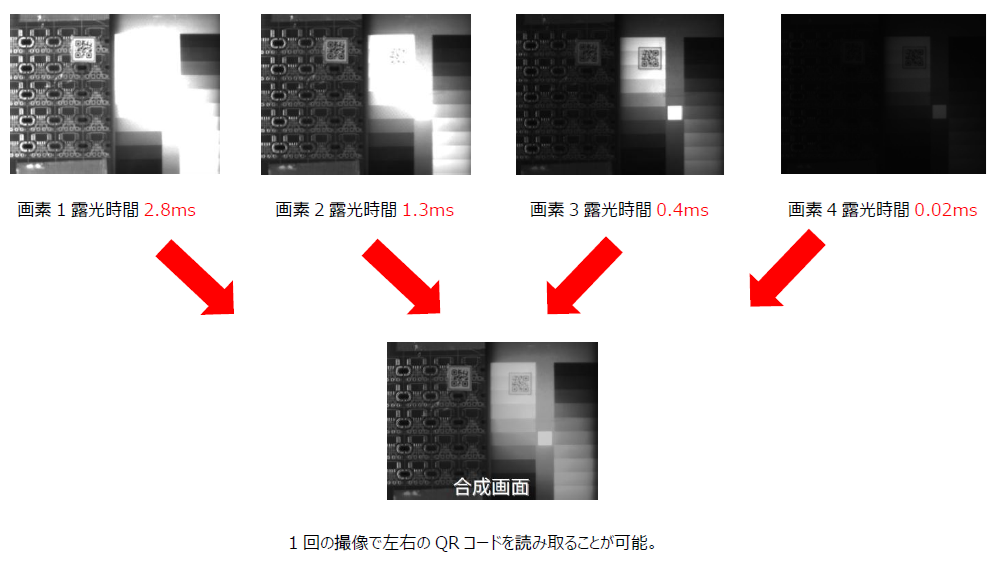 2x2の4つの画素単位でそれぞれ個別にシャッタータイミング、露光時間を設定することができます。